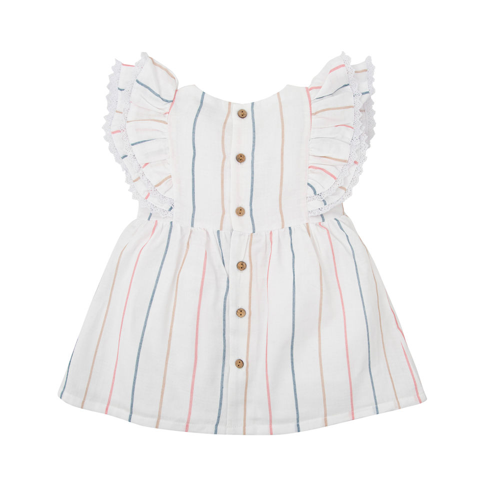 Babidu button down dress with frills and stripe detail. A beautiful addition to your little ones wardrobe this spring/summer. The light weight fabric will ensure your little one is kept cool whilst the pretty, simple design will ensure they look the part this summer!