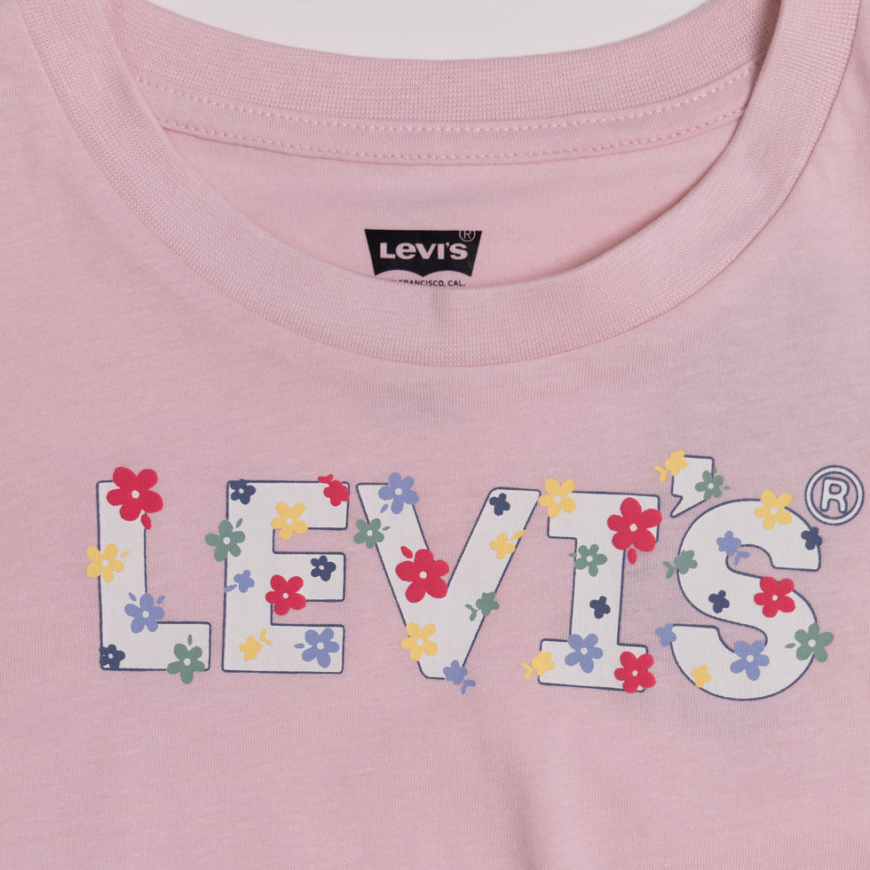 Levis crew neck T-shirt with floral logo. This beautiful design is an elevated everyday essential! The floral logo adds a touch of fun and detail whilst the gatherd/elasticated hem creates a comoftable and stylish silouette to the top. Pair with some glassic jeans or leggings for an every day look!