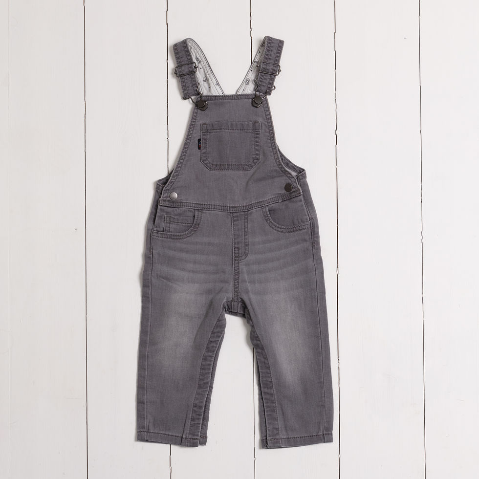 Mayoral soft denim dungarees available in light grey and mid-blue,